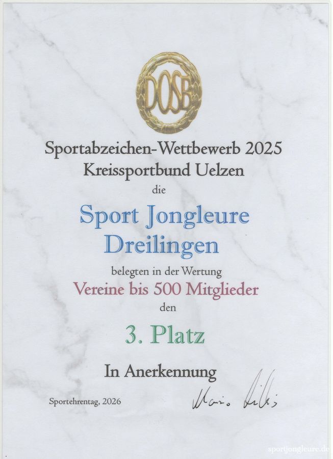 Insgesamt haben die Sport Jongleure 36 Sportabzeichen gesammelt und somit den dritten Platz beim Sportabzeichen-Wettbewerb 2025 des KSB Uelzen, in der Wertung Vereine bis 500 Mitglieder, erreicht.