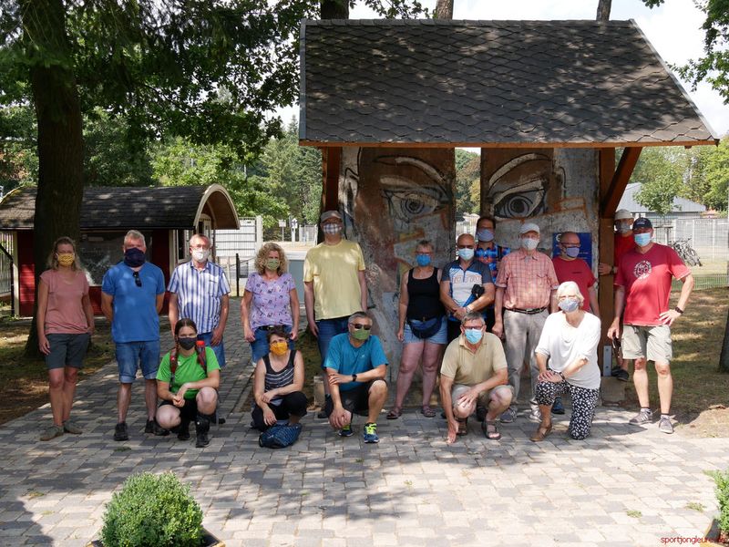 Es sollte ein schöner, warmer Tag werden. Mit 18 Teilnehmern kam eine bunte Gruppe zusammen, leider nur Erwachsene! Um 11 Uhr trafen wir uns in Eimke am Feuerwehrgemeinschaftshaus. Die Tour ging über das Lintzeler Kreuz nach Brambostel – erste Pause! Danach folgte aufgrund der langen Trockenheit der teilweise recht sandige Feldweg zur Schmarbecker Heide. Am dortigen Parkplatz gab es dafür die nächste Pause.