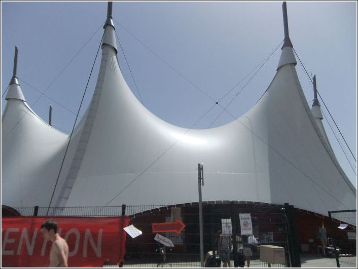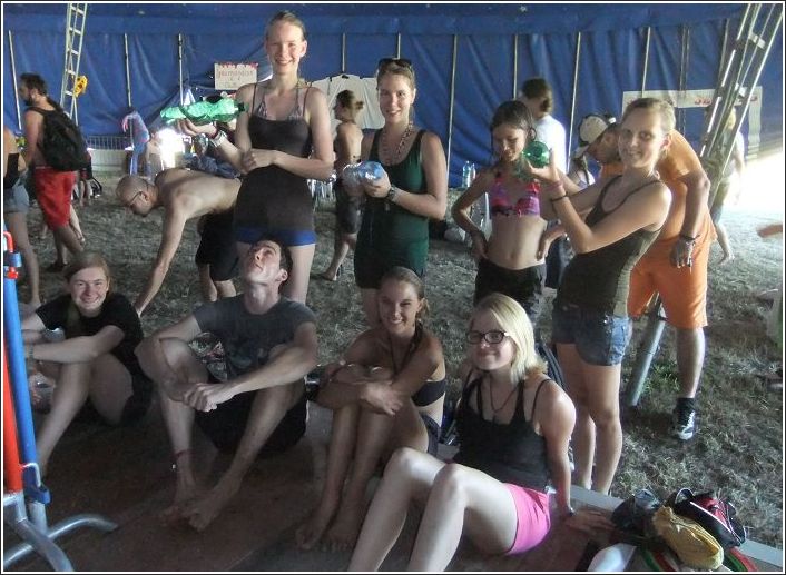 Der Montag startete mit einem Einkauf bei dem ca. 1 km entfernten LIDL. Vermutlich war diese Woche für den Supermarkt die umsatzstärkste Woche im ganzen Jahr. Gleich nach dem Einkauf gab es ein ausgiebiges Frühstück, um am Nachmittag die ersten Workshops zu besuchen, staunend andere Akteure zu bewundern oder in der Sonne bzw. in einer Halle an den eigenen Künsten zu arbeiten. Während ein Teil von uns bereits das Abendessen (welches größtenteils aus Nudeln mit Tomatensoße bestand) genoss, machten sich Anna, Thomas und ich auf den Weg zum Flughafen um (auf ziemlich interessante Weise: hin mit dem Auto und zurück mit der Metro) Kim Rothe abzuholen, die als zehnte und somit letzte Sport Jongleurin zu uns stieß. Nachdem wir nun alle in unserem kleinen „Sport Jongleure Dorf“ angekommen waren und die Zeltaufteilung für die ersten Nächte einigermaßen geklärt war, machte sich ein Teil auf den Weg in das Open-Stage-Zelt zu einer Show mit ganz unterschiedlichen Akteuren und Darbietungen.