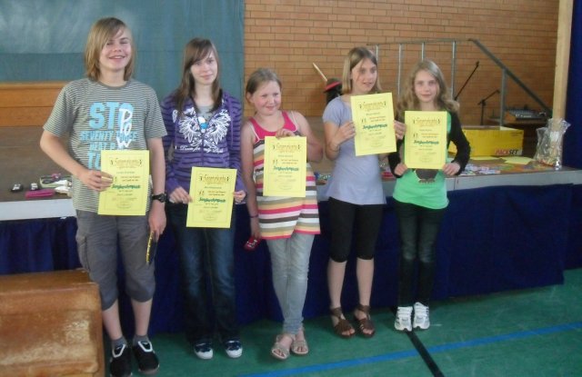 Sieger der Jonglierolympiade waren: Lucas Schröder, Ilka Hildebrandt, Stella Heinsch, Mirjam Wendt und Katja Prehm (von links nach rechts).