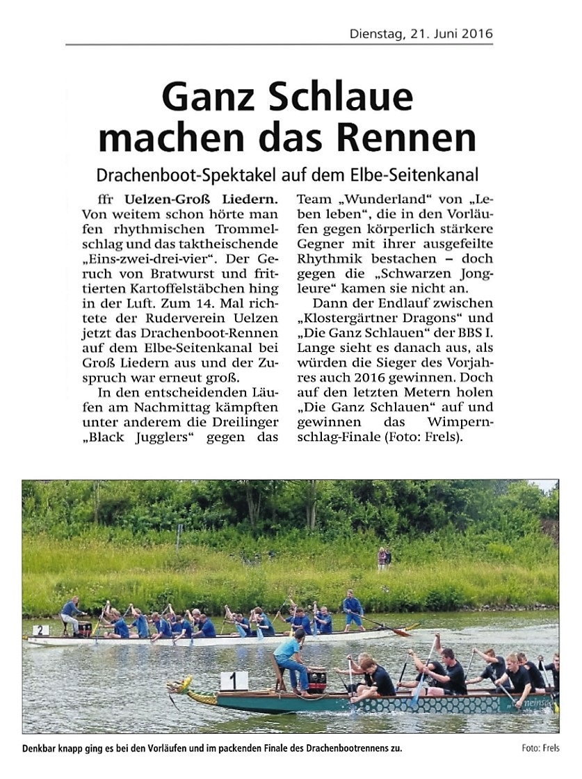 Zum 14. Mal richtete der Ruderverein Uelzen jetzt das Drachenboot-Rennen auf dem Elbe-Seitenkanal bei Groß Liedern aus und der Zuspruch war erneut groß. In den entscheidenden Läufen am Nachmittag kämpften die Dreilinger "Black Jugglers" gegen das Team "Wunderland" von "Leben leben", sh. Video, die in den Vorläufen gegen körperlich stärkere Gegner mit ihrer ausgefeilte Rhythmik bestachen – doch gegen die "Schwarzen Jongleure" kamen sie nicht an.