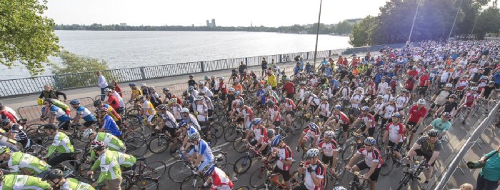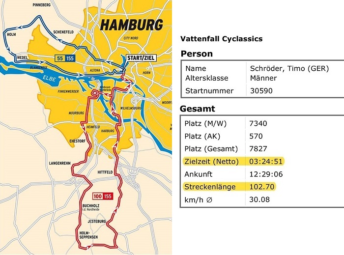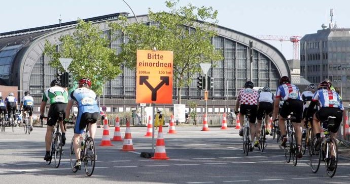 Ich war ein wenig nervös, denn bei einer derartigen Massenveranstaltung (ca. 20.000 Starter) war ich noch nie dabei. In der Aufregung bemerkte ich erst im Zug, dass ich mein Helm in Uelzen vergessen hatte. Um umzukehren war es zu spät, ich würde es nicht mehr rechtzeitig zu meiner Startzeit schaffen, obwohl ich erst aus dem letzten Block (Startblock S) um 8:50 Uhr starten sollte. Ich musste mir also einen neuen Helm besorgen, was sich als sehr schwierig herausstellte. Ohne Helm darf man nicht starten, das Rennen drohte also bereits zu Ende zu sein, bevor es überhaupt begonnen hatte. Erst als kurz vor meiner Startzeit die offizielle Messe auf dem Hamburger Rathausmarkt öffnete, konnte ich gerade noch rechtzeitig einen neuen Helm kaufen. Zum warm fahren war keine Zeit mehr, als ich mich als einer der letzten im Startblock einordnete. Ehe ich mich versah, ging mein Startblock auch schon in das Rennen.