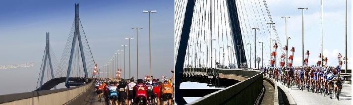 Als nach ca. 10 km der Anstieg zur Köhlbrandbrücke begann spaltete sich das Feld bereits in mehrere Gruppen. Ich war etwas schlecht platziert, sodass ich den Sprung in eine vordere Gruppe verpasste. Trotzdem fand ich nach und nach Gruppen, denen ich mein Tempo anpasste.
