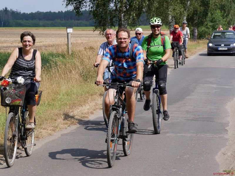 Es sollte ein schöner, warmer Tag werden. Mit 18 Teilnehmern kam eine bunte Gruppe zusammen, leider nur Erwachsene! Um 11 Uhr trafen wir uns in Eimke am Feuerwehrgemeinschaftshaus. Die Tour ging über das Lintzeler Kreuz nach Brambostel – erste Pause! Danach folgte aufgrund der langen Trockenheit der teilweise recht sandige Feldweg zur Schmarbecker Heide. Am dortigen Parkplatz gab es dafür die nächste Pause.